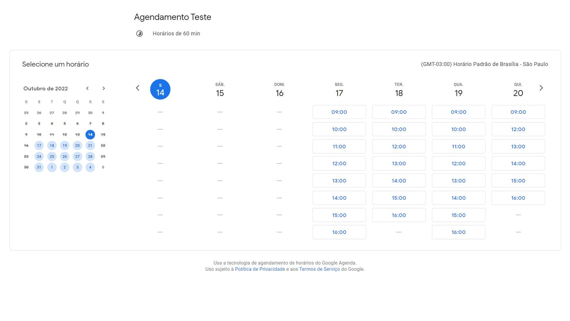 Aqui, qualquer pessoa com o link pode agendar um horário para uma reunião, encontro presencial, aula ou qualquer outro compromisso. Ao escolher o dia e horário, a pessoa deverá preencher com as informações solicitadas e a data ficará indisponível até que você ou o usuário cancele o agendamento.