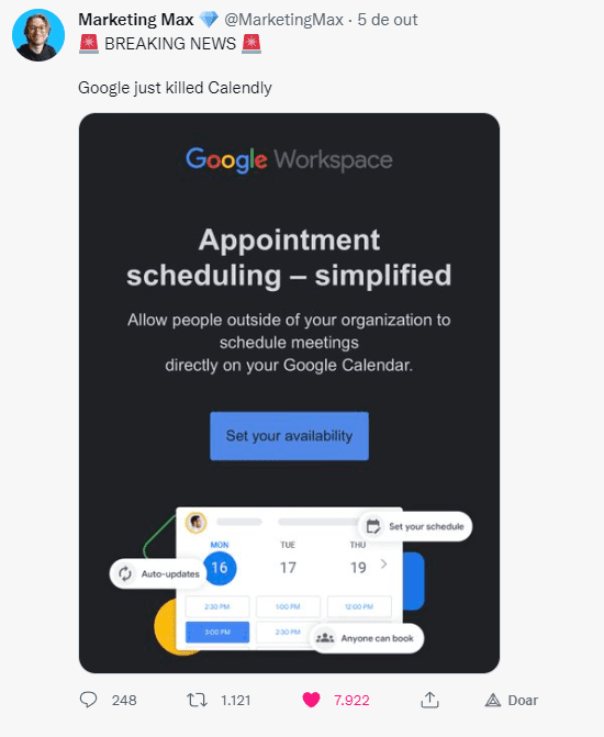 Na última semana, o Google compartilhou uma nova funcionalidade muito semelhante ao Calendly. Em seu Twitter, o especialista conhecido como Marketing Max (@marketinmax), compartilhou a seguinte atualização: