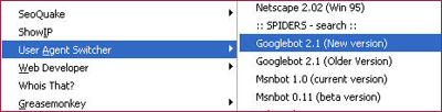- User-agent switcher: uma extensão do Firefox que também funciona para o Flock e Seamonkey. O que ela faz é trocar a identificação que o seu navegador envia ao acessar uma página para o user-agent que você quiser. Você vai precisar cadastrar os user-agents, ou então fazer o download de um arquivo xml com uma lista neste link.