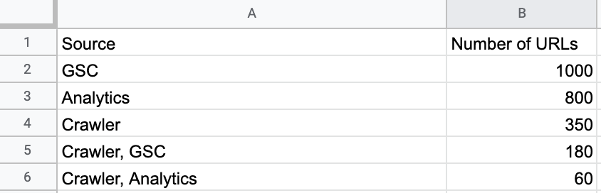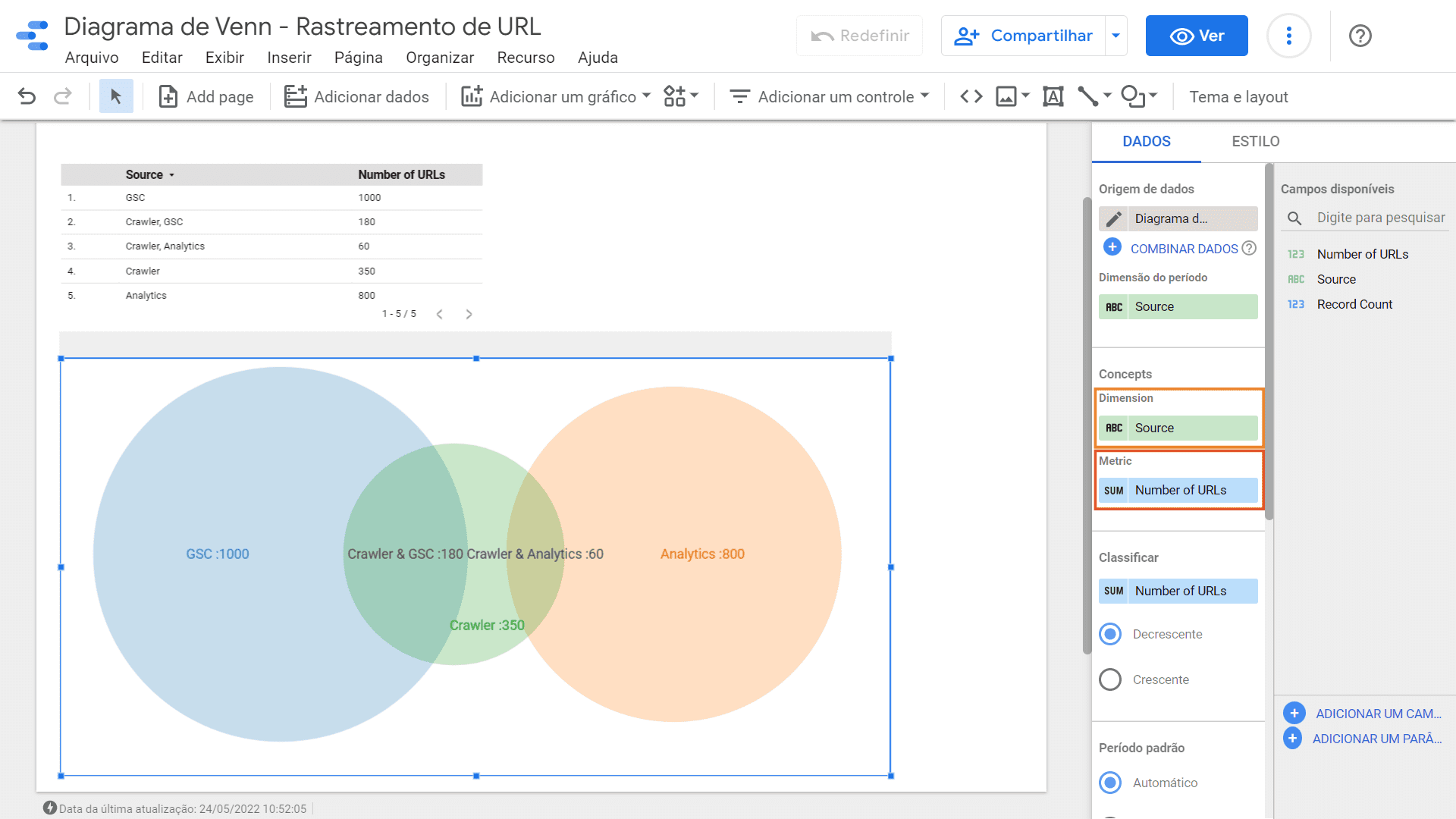 Os círculos se sobrepõem quando as Origens compartilham valores comuns, nesse caso podemos determinar que das 350 URLs rastreadas pela Crawler, 60 também foram rastreadas pelo Analytics e 180 pelo GSC.