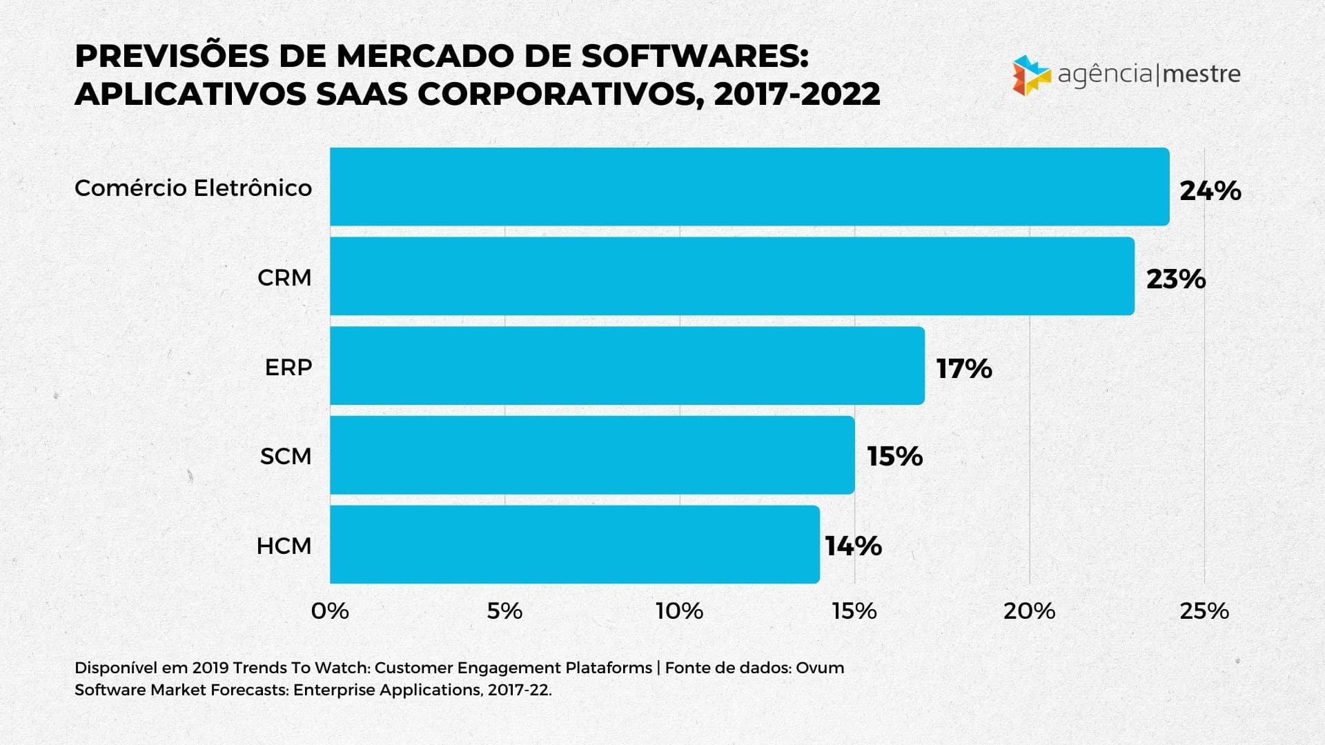 Ainda na pesquisa realizada pela Ovum, um dado interessante mostra que, desde 2018, os investimentos em SaaS corporativas estão demonstrando sucesso dos CRMs. De acordo com o relatório, plataformas de CRM e Comércio eletrônico teriam uma taxa de crescimento semelhante até 2022: