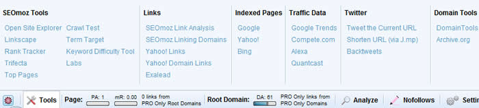 - Links para todas ferramentas do SEOmoz e ainda para Google Trends, busca com o comando site: e DomainTools;