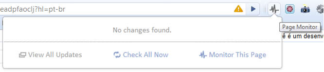 Ao longo das imagens mostrando as extensões, uma extensão diferente esteve sempre ali, ao lado da extensão mozBar: é a Page Monitor. Esta também é uma extensão que eu já tinha instalada no Chrome antes mesmo dessa mudança de browsers. Como o nome diz, ela monitora uma página e notifica alterações que aconteça nela.