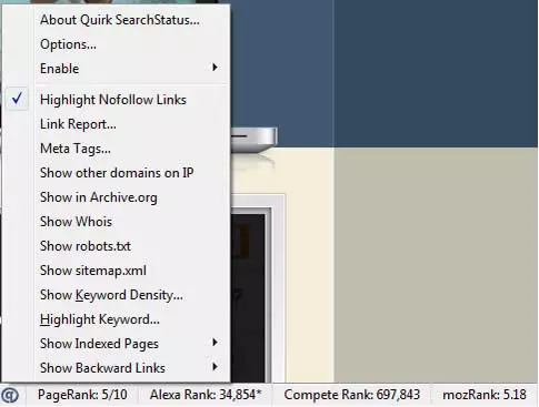 Nessa leva de funcionalidades da extensão mozBar, a Search Status e a SEObook toolbar foram cobertas em vários pontos e com a adição de outras opções.