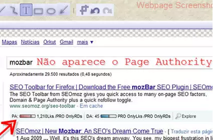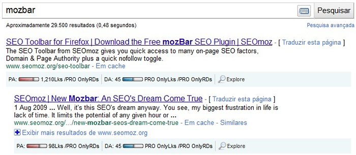 - Mostra relevância da página com Domain Authority, Page Authority, quantidade de backlinks e mozRank (e outras informações quando se é assinante PRO do SEOmoz);