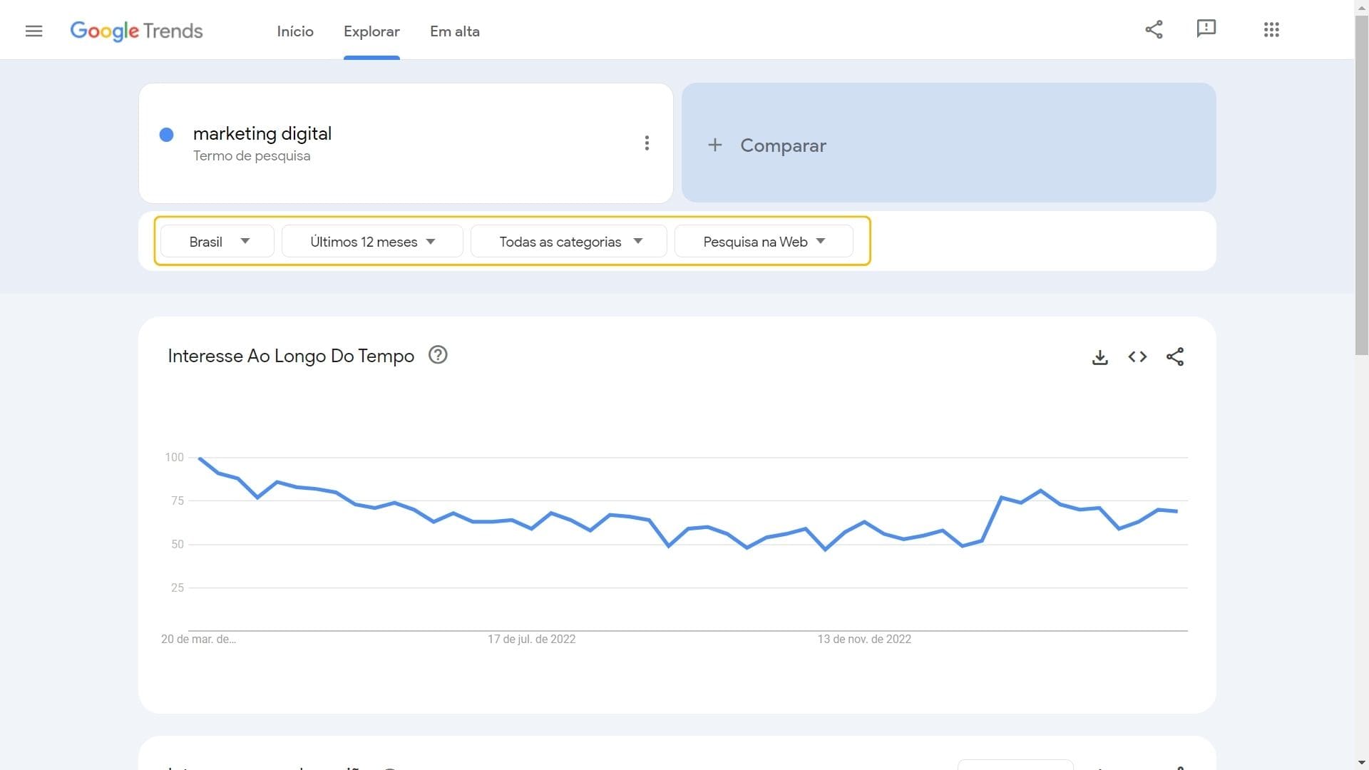 No Trends, é possível visualizar as principais e as crescentes consultas sobre qualquer assunto. Além disso, você consegue filtrar os resultados por:
