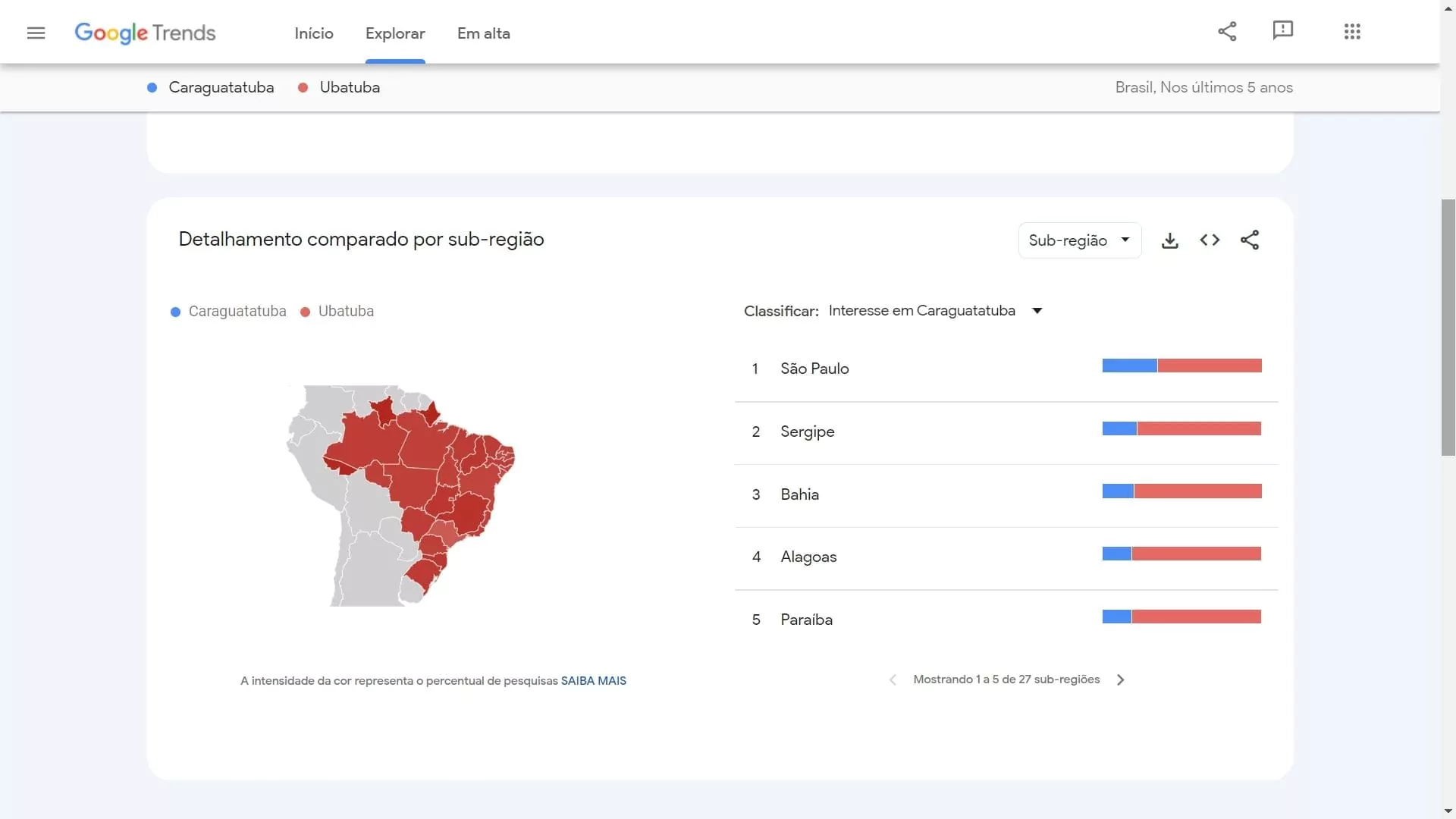 No bloco “Detalhamento comparado por sub-região”, é possível ver quais regiões do Brasil fazem mais buscas sobre o tema que você deseja promover. Veja como é simples analisar os dados: