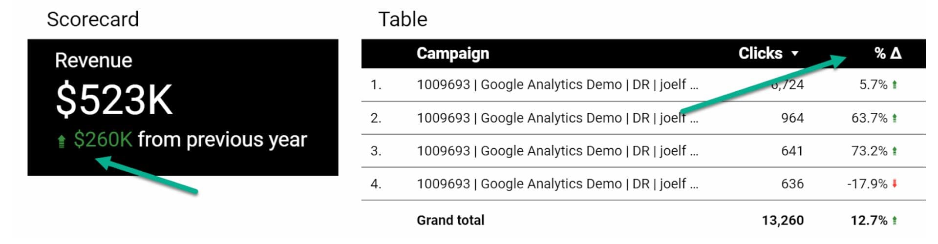 Depois, é só adicionar a cor das setas que sinalizam a mudança, no painel “Estilo”. Quando utilizar os scorecards, ainda é possível selecionar se deseja mostrar a evolução como valor absoluto ou percentual.