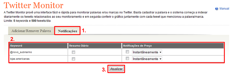 2) Uma tabela com as palavras monitoradas por você será exibida. Na coluna “Resumo Diário” você pode marcar as palavras que deseja receber um e-mail diário com todos os tweets capturados pela ferramenta. Já na coluna “Notificações de Preço” você marca as palavras que deseja receber um e-mail, com os tweets que notificam preços. Para os tweets com notificações de preço ainda é possível escolher se o e-mail será instantâneo, a cada uma hora ou cada dia.
