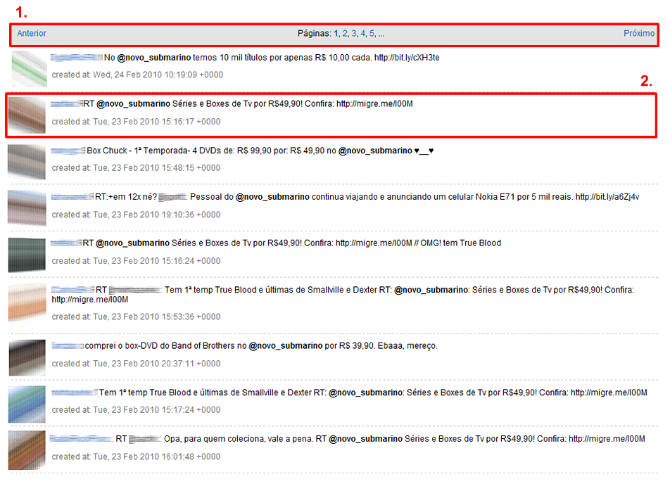 1) É possível ver todos os tweets relacionados à palavra monitorada. O controle da paginação é feito através das opções: “Anterior”, “Próximo”, ou clicando diretamente em um dos números.