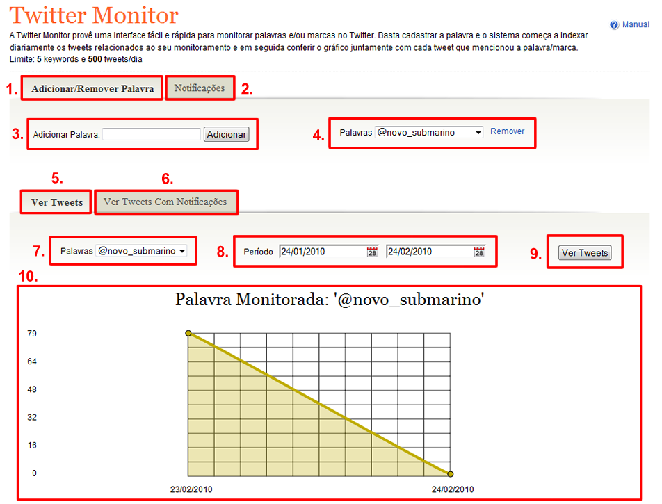O funcionamento é simples. Basta cadastrar uma palavra no Twitter Monitor e você começa a acompanhar todos os tweets que são lançados pelos usuários do Twitter.