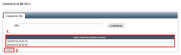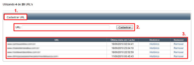 1) Através da aba “Cadastrar URL’s” o usuário realiza o cadastro de suas URL’s e visualiza uma tabela com as URL’s que está monitorando no momento. Cada usuário pode monitorar até 25 URL’s ao mesmo tempo.