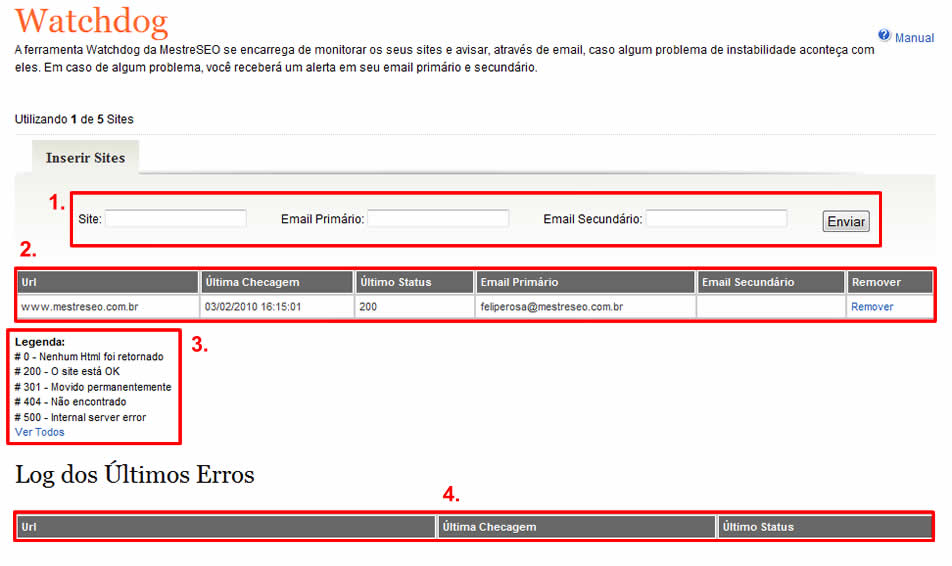 1) Para iniciar o monitoramento de seus sites, basta entrar com a URL do site, entrar com seu e-mail primário e, se desejar, e-mail secundário. Para incluir os dados em nosso sistema, clique no botão “Enviar”.