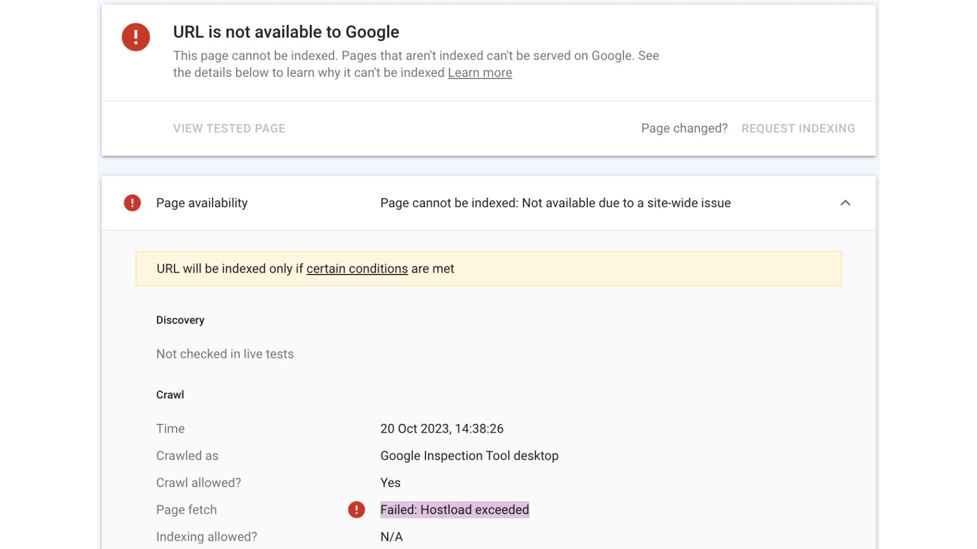 Na última semana (20), os usuários do Google Search Console começaram a notar uma sobrecarga na ferramenta de solicitação de indexação de páginas no buscador, com uma mensagem informando que a carga de host havia sido excedida: