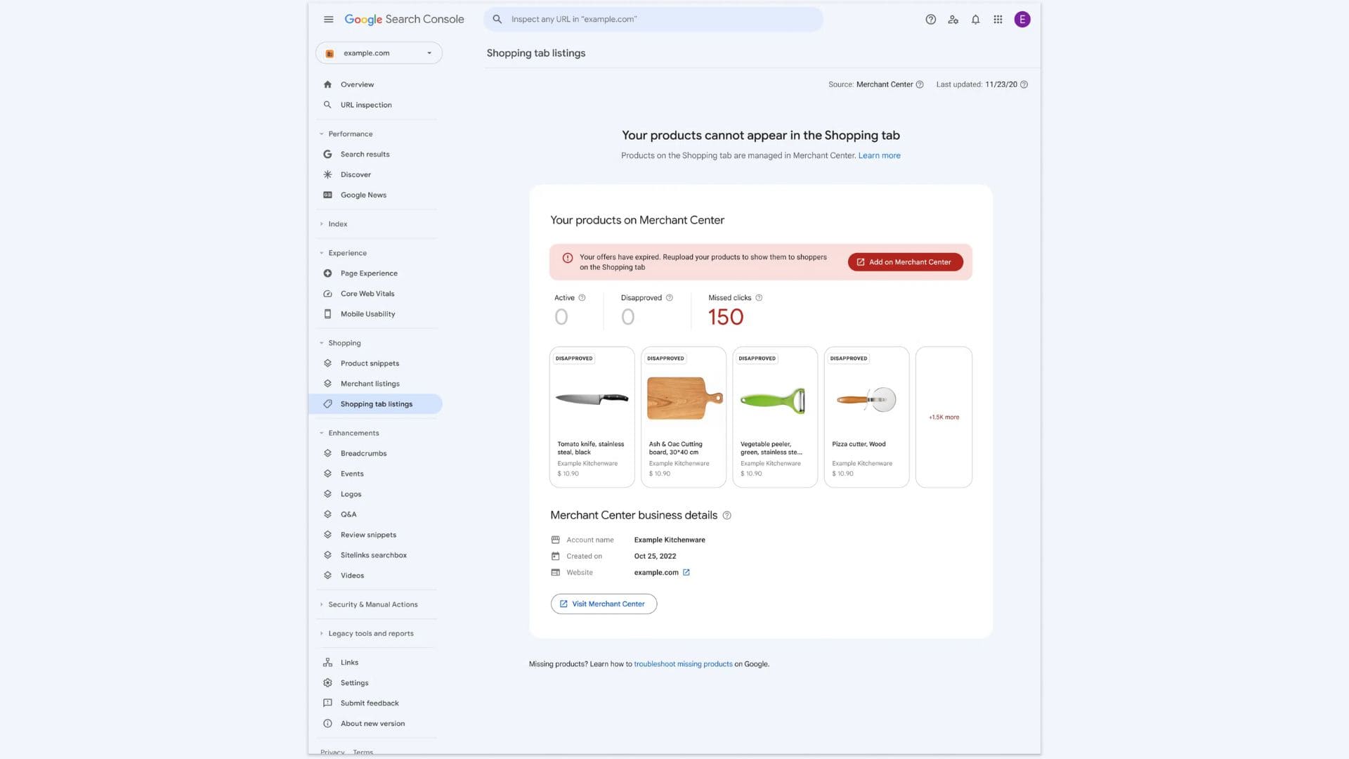 Este relatório vai notificar os comerciantes quando seus produtos pararem de aparecer na guia Compras devido a algum problema, com informações semelhantes às que o comerciante pode obter no Google Merchant Center, mas a integração vai exibi-la também no Search Console.
