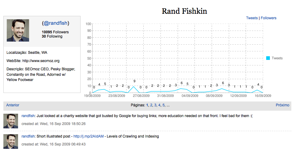 O interessante nesta página é que você possui toda a informação necessária para saber o que o guru está falando e a quantidade de tweets que ele envia por dia. É bem interessante navegar nos tweets do guru para verificar o que foi falado nos últimos dias ou horas, caso você não tenha acompanhado diretamente no Twitter.