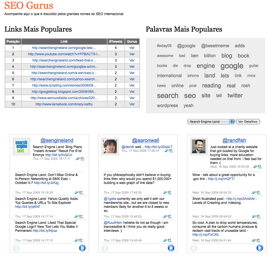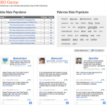Na área de Links Mais Populares, a idéia era organizar os links enviados por todos os gurus, de forma que você possa entrar na ferramenta e saber quais são os tipos de conteúdo recomendados por estes gurus. Um artigo importante sempre será indicado pelo gurus, ou ainda uma novidade no Google sempre será reportada por eles. Com base nesta idéia, listamos os links mais citados das últimas 48 horas. Caso você clique em “Ver”, uma caixa é aberta, mostrando quais os gurus que mencionaram este link. Um fato importante a ser mencionado é que fazemos a conversão de URLs encurtadas, desta forma, contabilizamos apenas as URLs “reais” do conteúdo indicado, facilitando o trabalho de saber onde foi enviado e sobre o que se trata cada link.