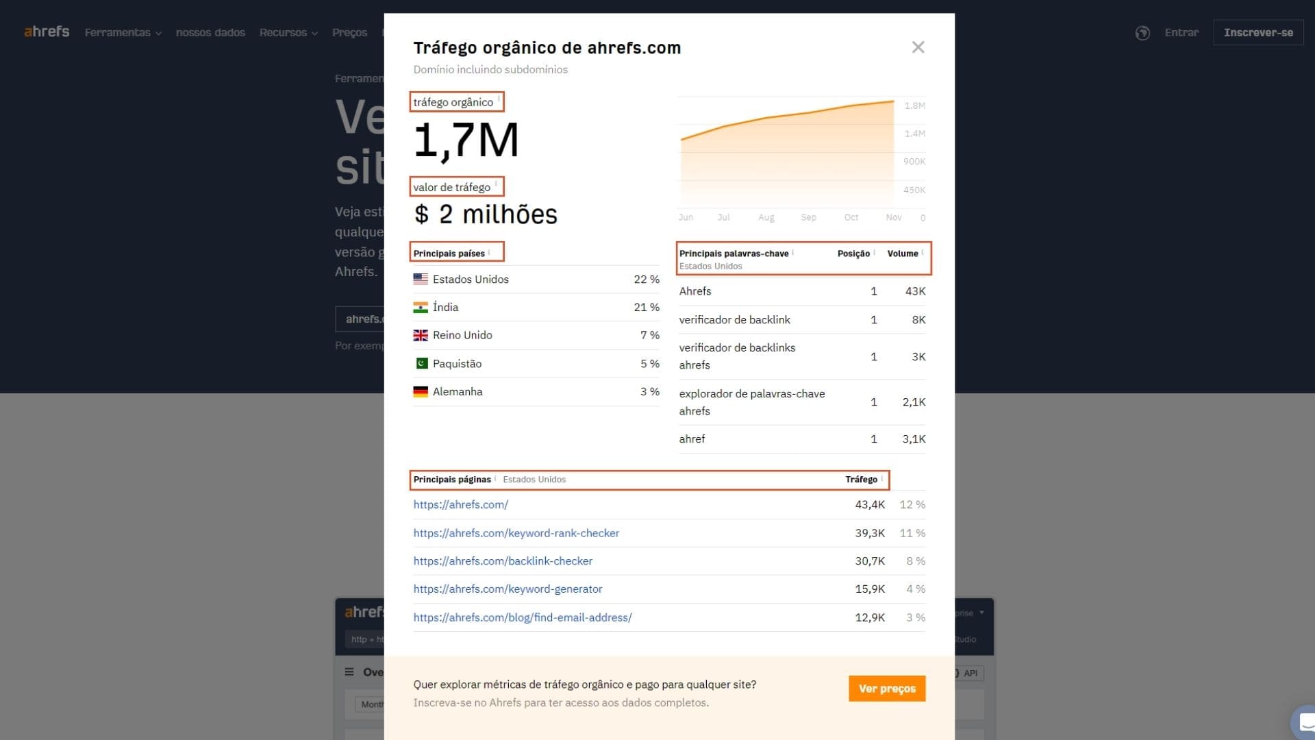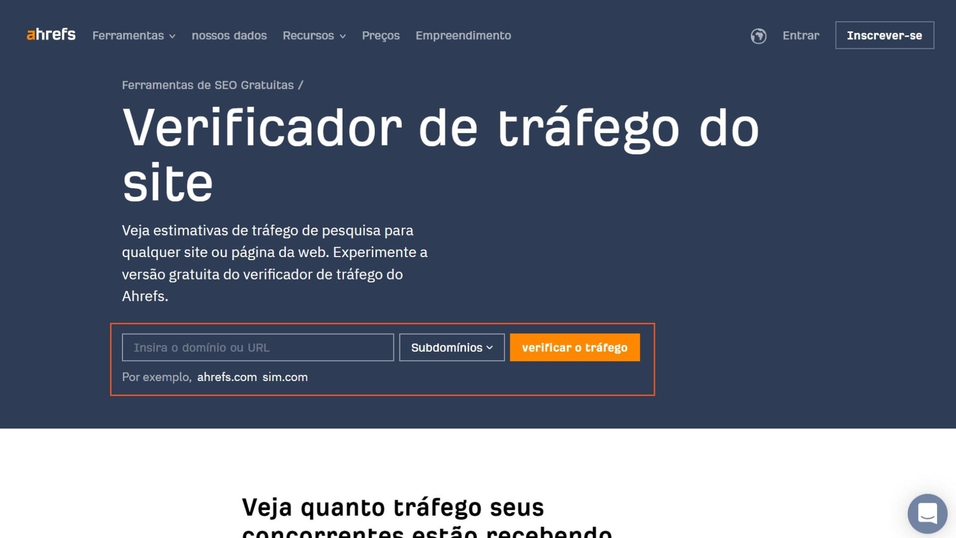 Com a ferramenta Site Explorer, da Ahrefs, é possível obter estimativas de tráfego de pesquisa de qualquer site ou página da web.