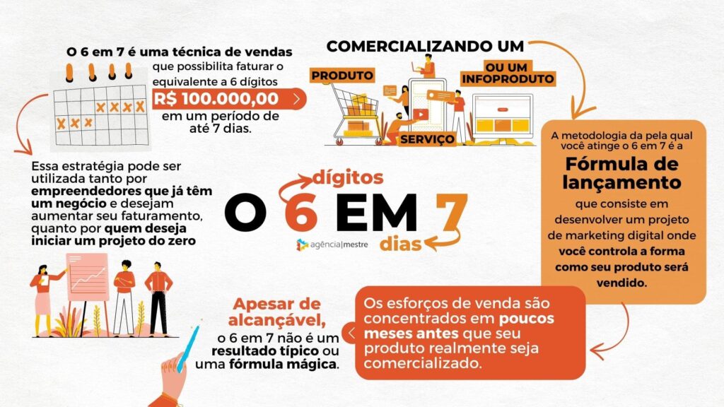 O 6 em 7 é uma terminologia da fórmula de lançamento, na qual é utilizado um método para atingir um resultado financeiro de seis dígitos (acima de $100.000,00 reais), em sete dias consecutivos. Ou seja, trata-se de uma uma expressão utilizada para quando se pretende atingir um número expressivo de vendas em um curto período de dias.