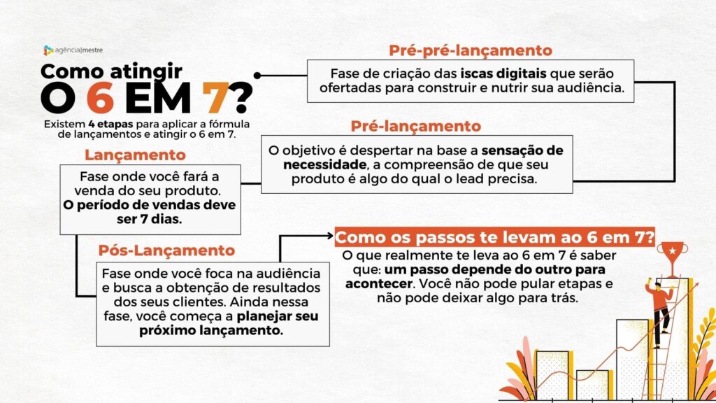 A proposta do 6 em 7 surgiu a partir da fórmula de lançamento, uma metodologia de marketing que te encaminha por um processo muito bem estruturado, explicando em detalhes como usar a internet para escalar suas vendas ou criar um negócio digital do zero.