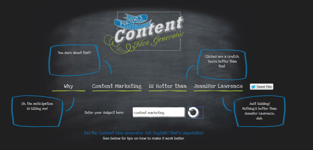Assim como a Hubspot, a Portent tem uma ferramenta que executa a mesma função. A diferença é que você pode colocar apenas uma palavra, e automaticamente ela irá gerar um tema que você pode trabalhar. Caso não goste da sugestão, basta clicar no botão que fica ao lado da barra onde você digitou o termo que irá escrever e ela te dará outro título. Ela também é em inglês, então será preciso fazer a tradução.