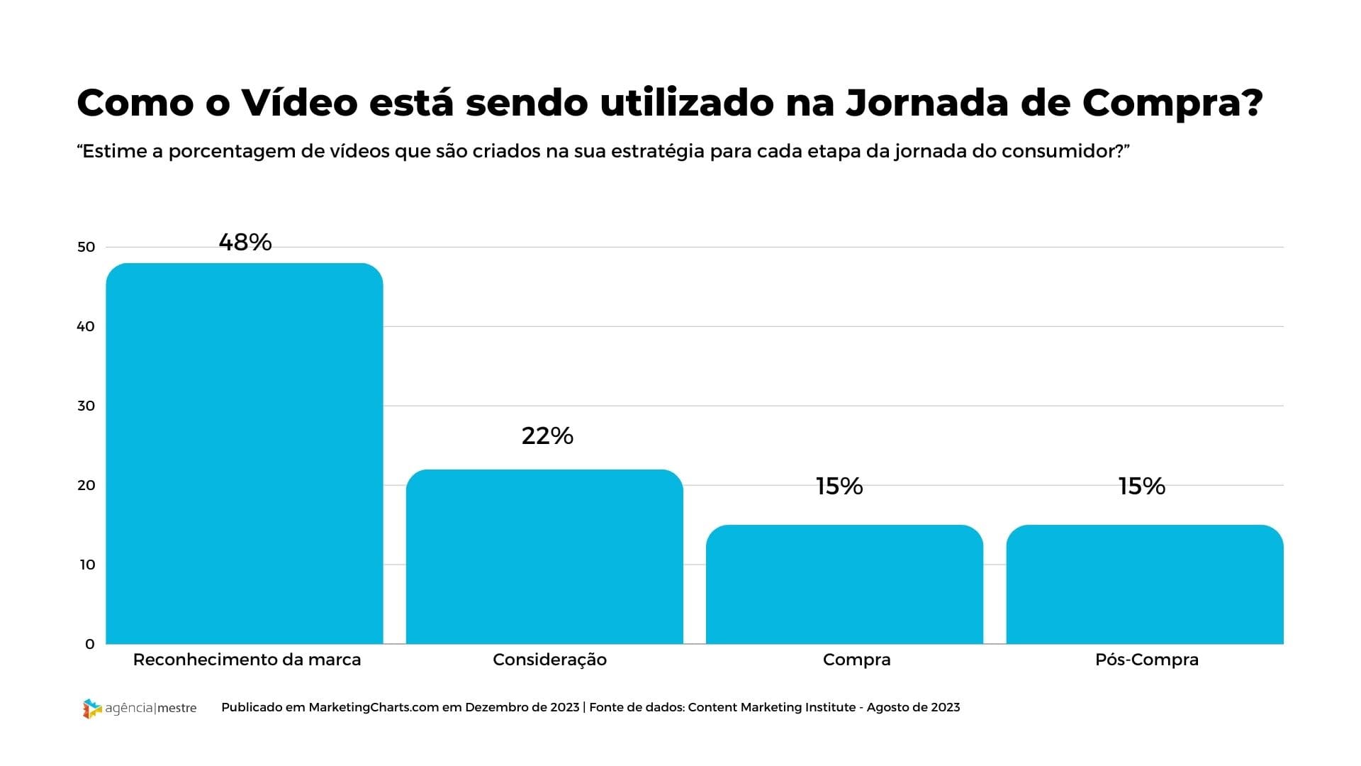 Em seu estudo, o Content Marketing Institute solicitou que os participantes estimassem a porcentagem de seus vídeos criados para os vários estágios da jornada do consumidor e os resultados indicam uma média de 48% para o estágio de reconhecimento da marca, onde os compradores estão conhecendo a empresa: