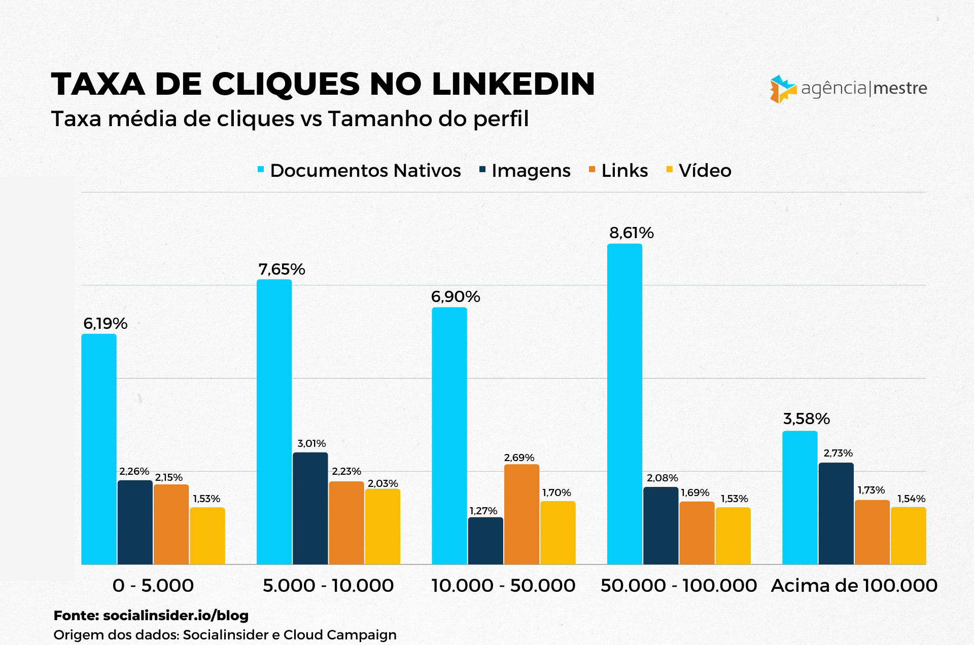 De acordo com o estudo, a taxa de cliques para as postagens de “documentos nativos”, ou seja, posts em formato de PDF carregados diretamente no LinkedIn e exibidos em formato de carrossel, é três vezes superior aos outros formatos.