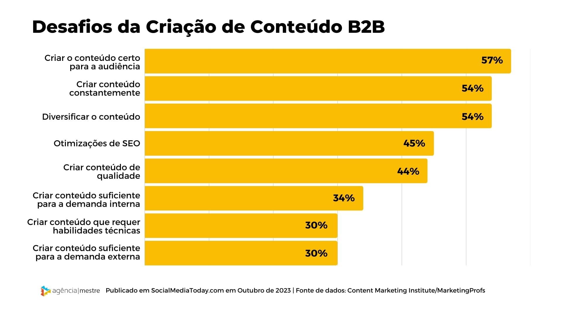 Além das dificuldades para alcançar e conversar com o público ideal, os profissionais entrevistados pelo Content Marketing Institute listam que os maiores desafios da criação de conteúdo B2B são:
