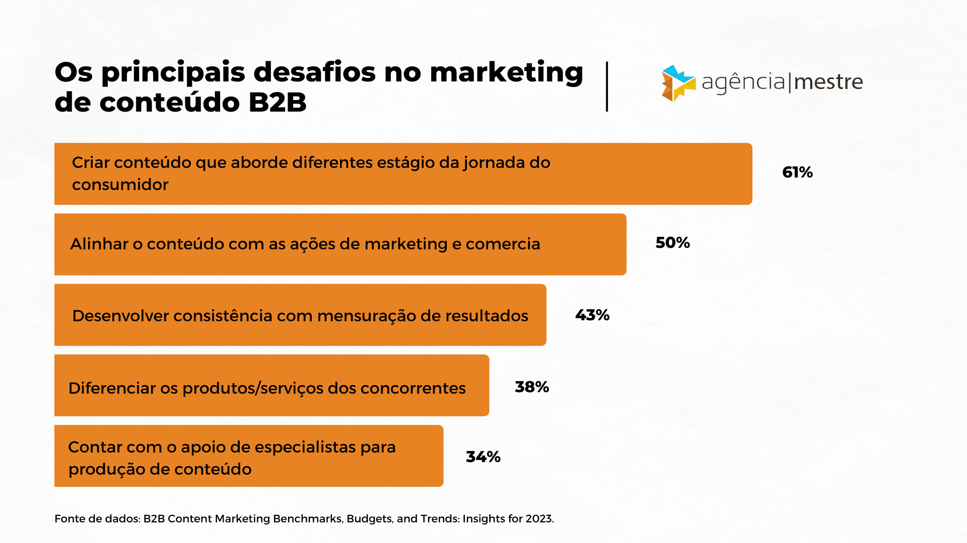Além disso, uma nova pesquisa do Content Marketing Institute mostra que os profissionais de marketing do setor B2B vêm enfrentando diversos desafios para escalar suas estratégias de marketing de conteúdo e conquistar o público certo com suas produções.