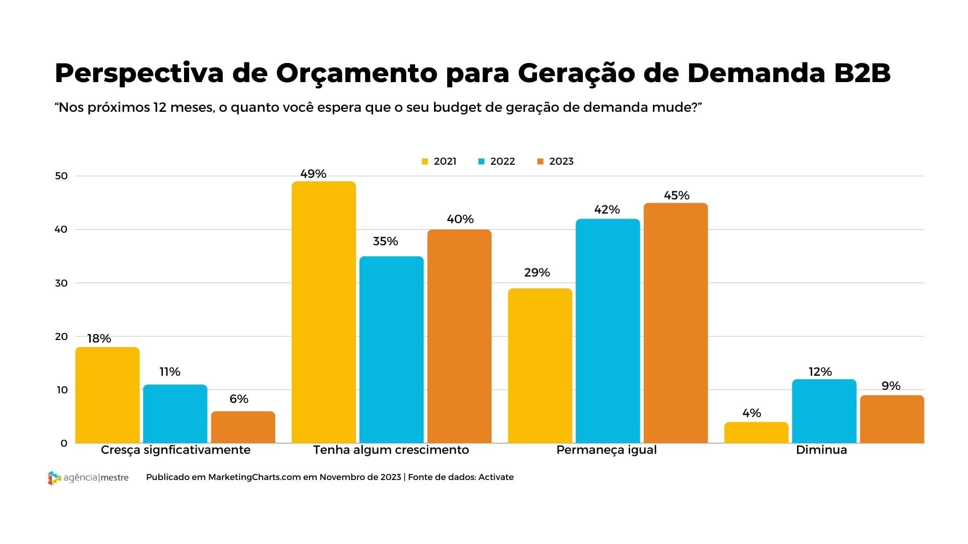 Além do estudo realizado pelo Content Marketing Institute, o último relatório anual “State of Demand Gen” da Activate, produzido em parceria com a Marketing Charts, mostra que este ano, cerca de 46% dos profissionais de marketing B2B esperam que o seu orçamento para a geração de demanda cresça significativamente ou ligeiramente durante os próximos 12 meses.