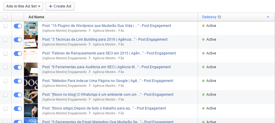 Uma estratégia que eu gosto muito é ter um grupo de anúncio dentro de cada uma das plataformas das mídias pagas, que reúne ao menos um anúncio para cada artigo, sendo que este grupo de anúncio possui um budget diário para que as publicações sejam concorrentes ao longo do dia para serem exibidas ao usuário.
