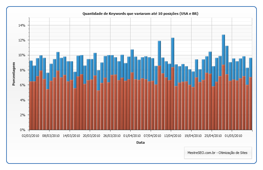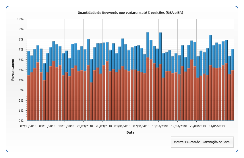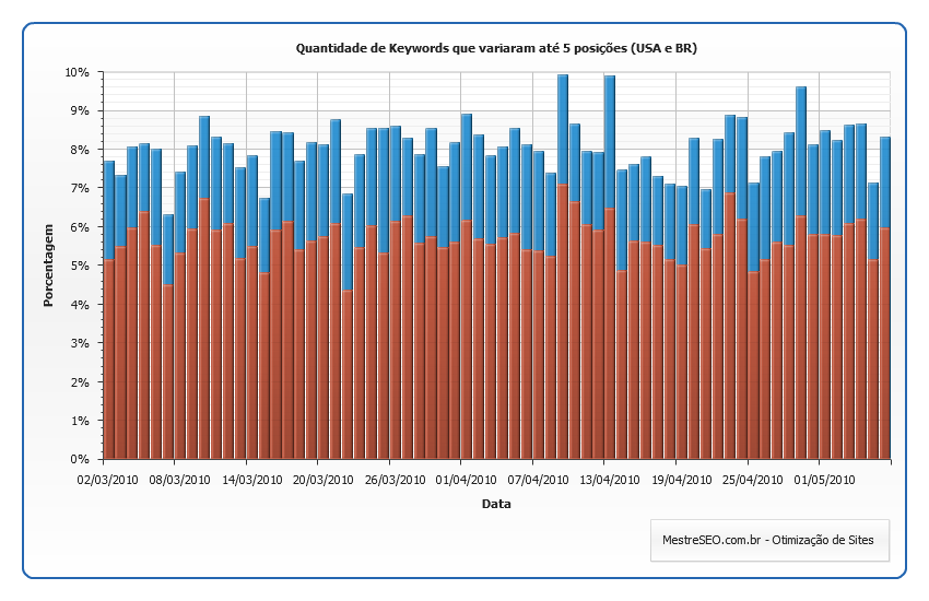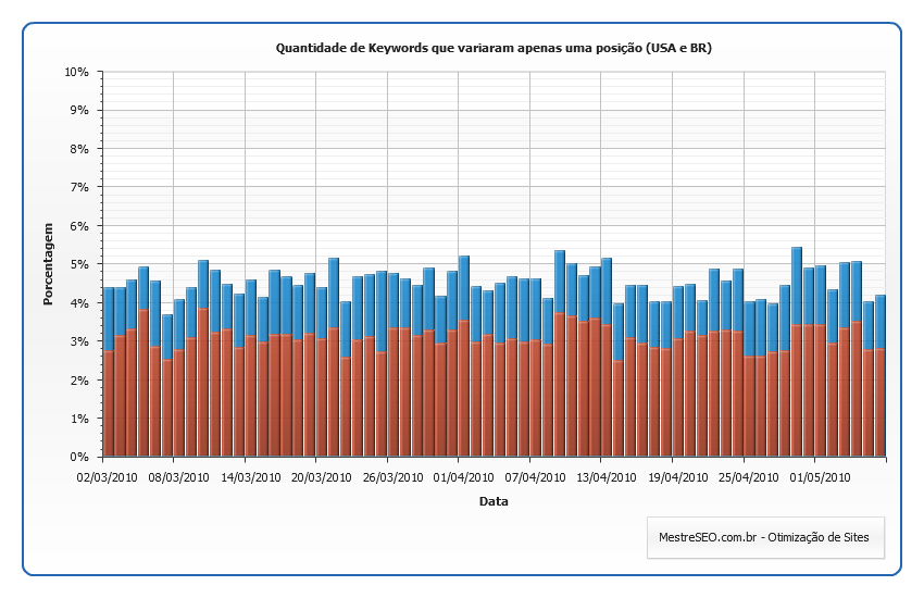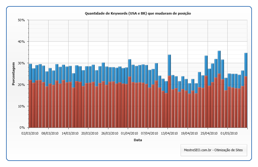 Com base em dados da nossa ferramenta Rank Tracker, analisamos a porcentagem de keywords que mudaram de posição nos últimos 2 meses, em buscas feitas no Google USA (em azul) e no Google BR (em vermelho):