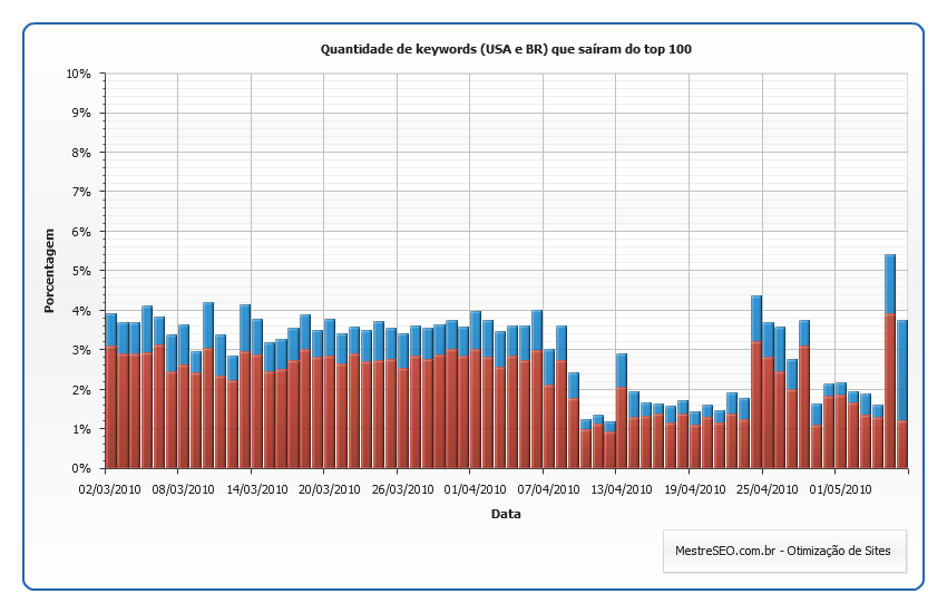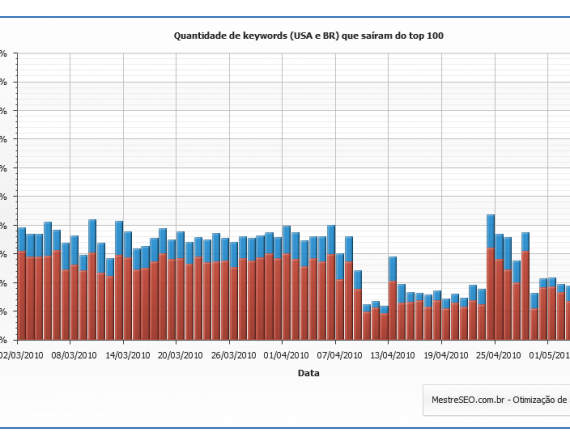 Podemos perceber que existe uma variação natural na porcentagem de keywords que mudam de posição em ambas as engines, mas percebemos também que a amplitude dessa variação muda, aproximadamente a partir do dia 07/04/2010. Pensamos então em analisar essa variação, e tentar observar o comportamento das keywords que se encontram nas 10 primeiras páginas de resultados. Obtemos o seguinte gráfico, que mostra a porcentagem de keywords que saíram do Top 100 do Google: