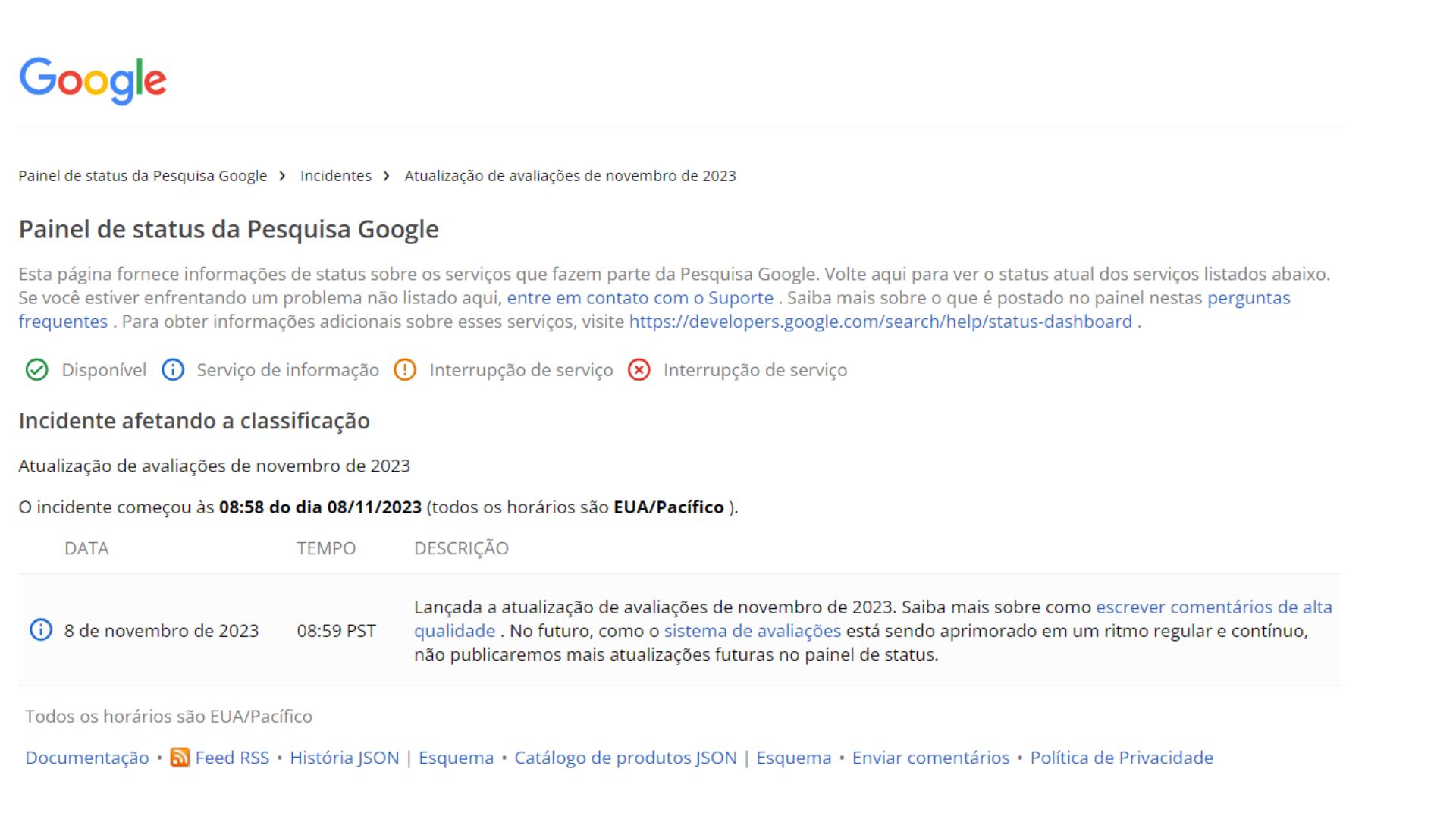 Segundo compartilhado pelo buscador, essa será a última atualização anunciada para essa função específica do algoritmo, visto que “no futuro, o sistema de avaliações será aprimorado em um ritmo regular e contínuo”, então não serão mais publicadas as atualizações futuras no painel de status.