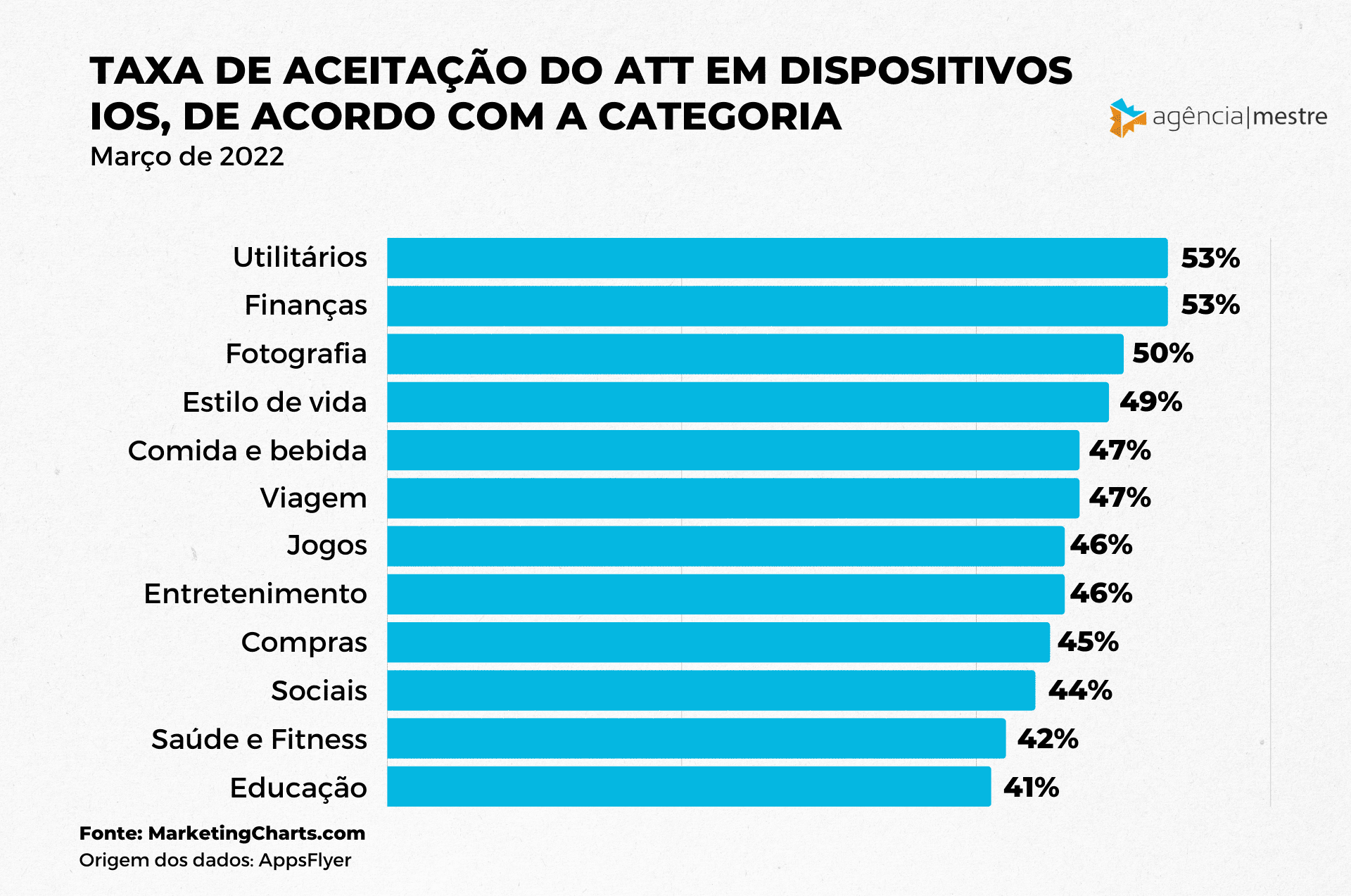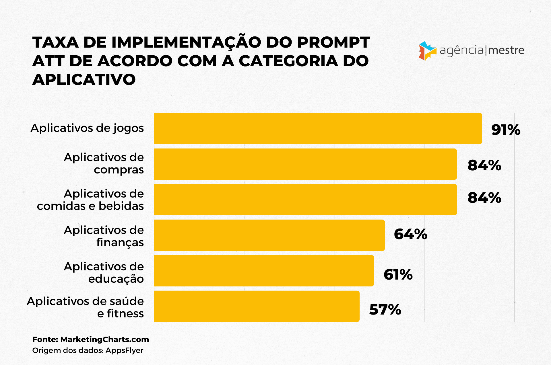 Essa taxa de conversão mostra que 46% dos usuários aceitaram a iniciativa da Apple e, consequentemente, estão permitindo que seus dados sejam rastreados. A variação quanto à categoria do aplicativo é um pouco menor, se comparada a oscilação de implementação do prompt ATT: