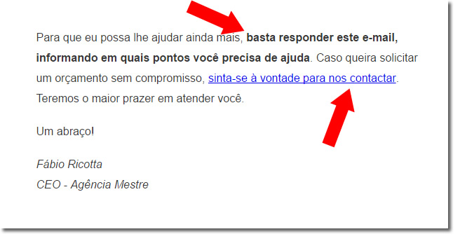 Você também pode convidar o usuário para responder o e-mail, caso ele tenha ficado com alguma dúvida ou queira fazer uma sugestão. Esse modelo funciona muito bem e as pessoas sentem-se mais motivadas a interagir.