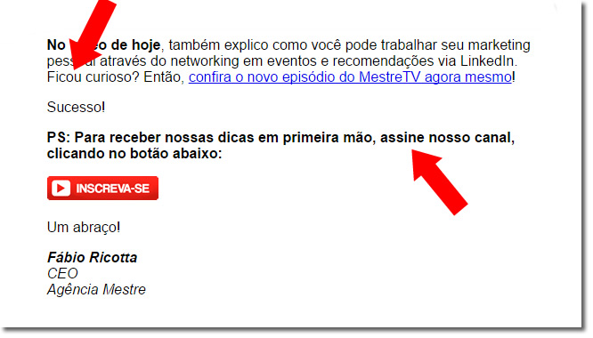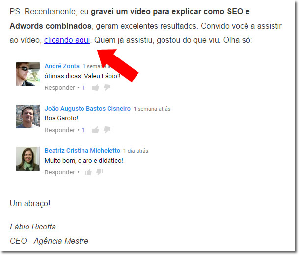 Na imagem abaixo, você pode observar uma chamada para ação que promovemos no “PS” do e-mail, convidando o usuário a assistir um vídeo em nosso canal do YouTube. Nesse caso, ainda utilizamos a questão da prova social para potencializar os cliques, exibindo o depoimento de pessoas que já viram e gostaram do vídeo.