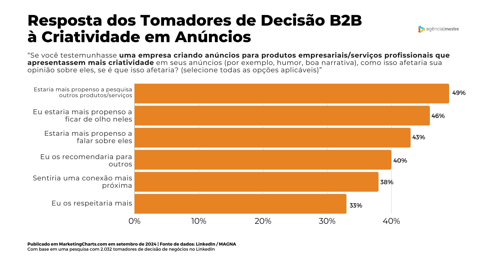 Segundo um estudo realizado pela Magna em parceria com o LinkedIn, os anúncios considerados como “criativos” levaram a um aumento de 40% na consideração de compra entre tomadores de decisão B2B.