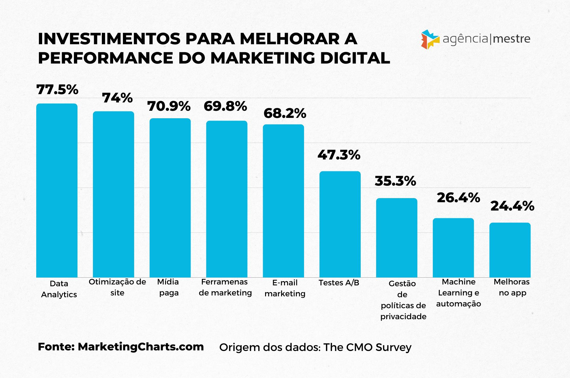 No ano passado, cerca de 77,5% dos entrevistados de nível sênior disseram que investiram em analytics para aumentar o desempenho do marketing digital.