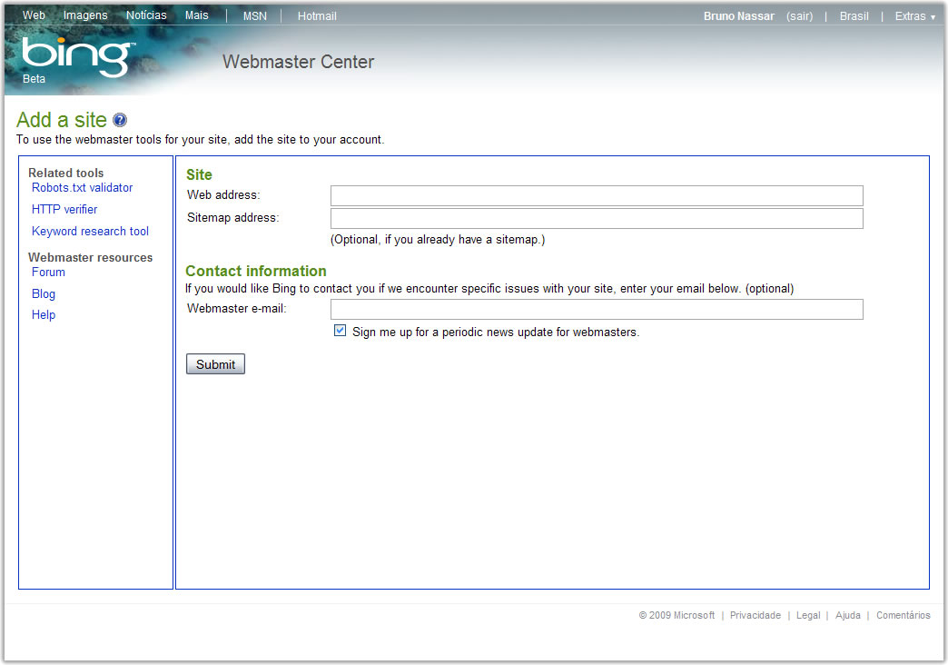 legal o post! Mas como eu faço pra entrar no Webmaster Center do Bing?