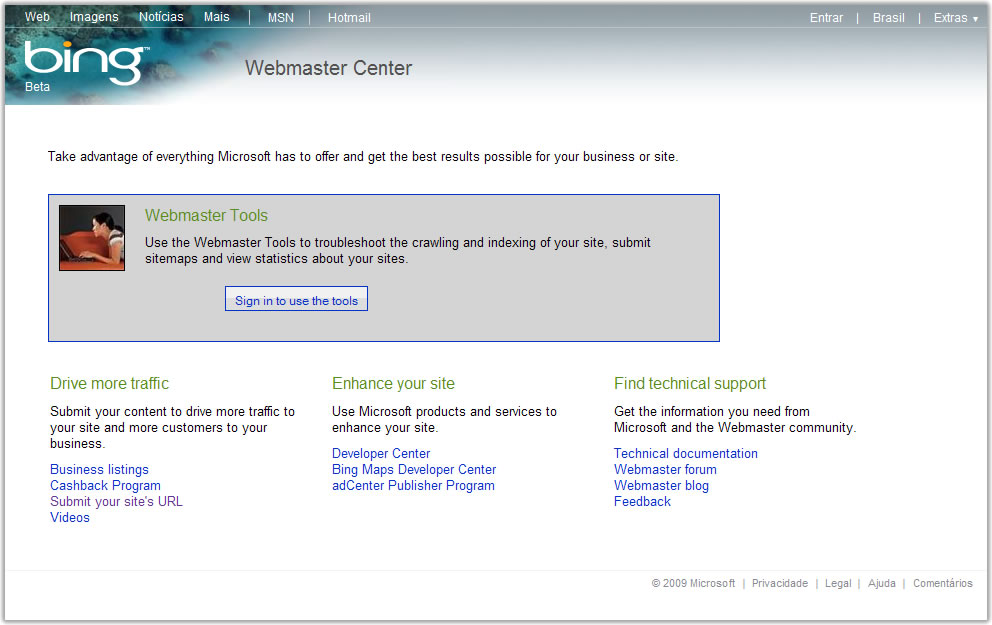 Primeiro, é preciso criar uma conta no Windows Live para logar no Webmaster Center do Bing, conforme é possível notar na figura abaixo: