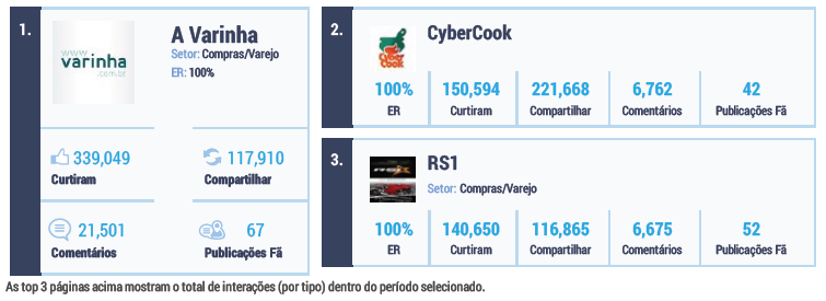 - As 3 páginas com maior engajamento foram: A Varinha, Cybercook e RS1;