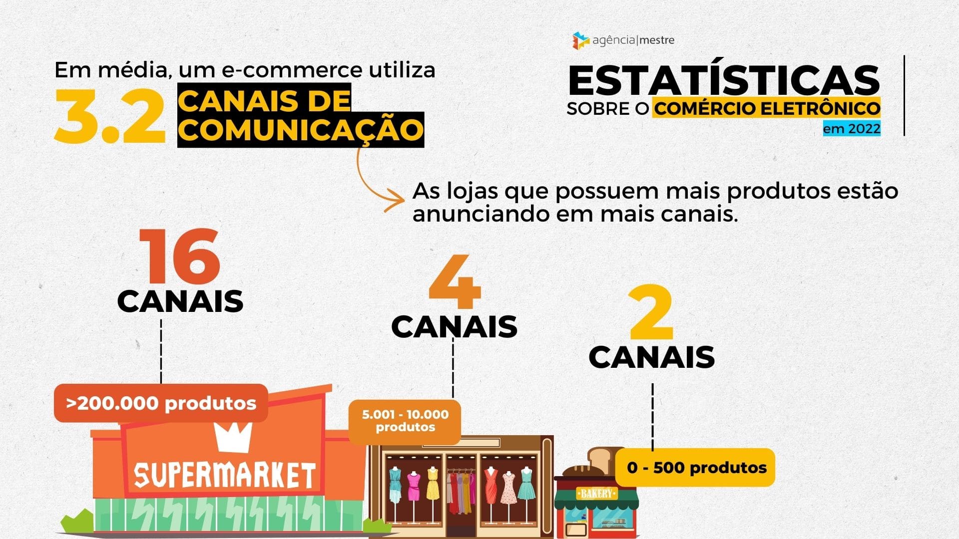 A média das lojas online é de anunciar em, pelo menos, 3.2 canais de comunicação, no entanto, lojas que possuem mais de 200.000 produtos costumam utilizar 16 canais diferentes, enquanto aquelas com cerca de 500 produtos utilizam apenas dois canais.