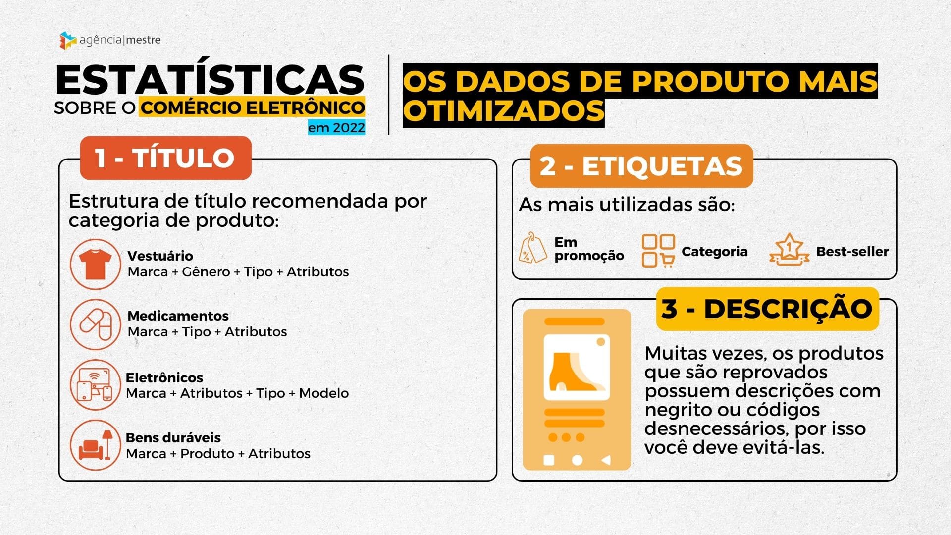 - descrição: um dos fatores mais importantes para os produtos e que, muitas vezes, incluem erros, como a inclusão de códigos e fontes desconhecidas que impedem os buscadores de ler o feed de produtos corretamente.