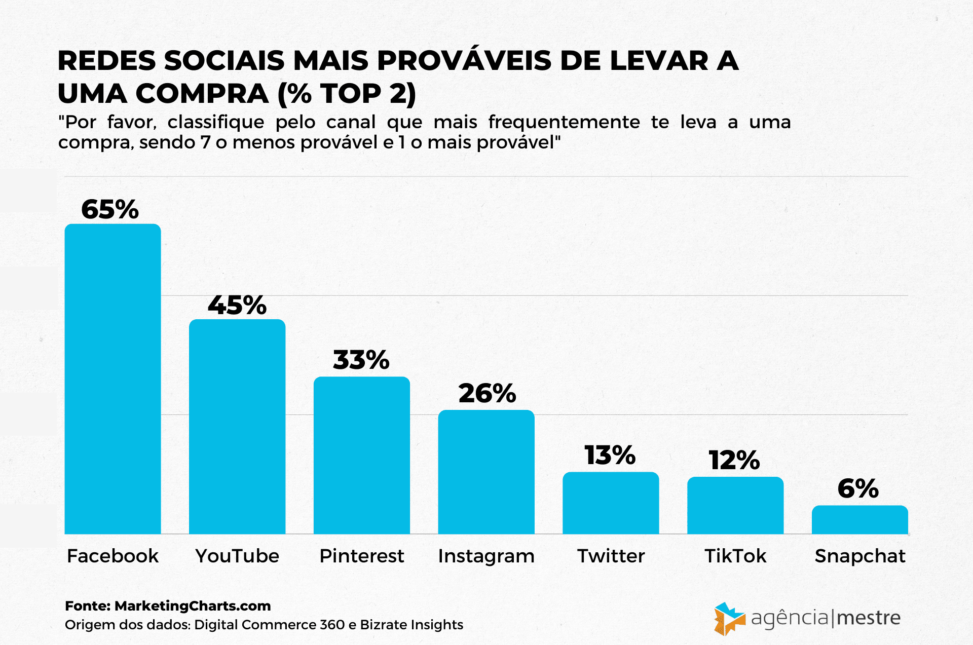Engana-se quem acha que o Facebook está esquecido ou que os esforços de marketing na rede são irrelevantes. A pesquisa mostra que, dentre as opções, 65% dos entrevistados consideram o Facebook como uma entre as duas redes sociais mais provável de levá-los a uma compra.