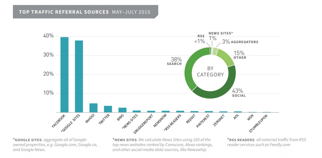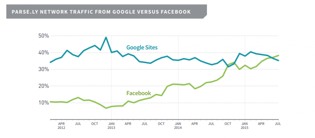 De acordo com a Parse.ly, uma empresa especializada em plataforma de analytics para conteúdo, o Facebook passou o Google em tráfego de referência (38,2 porcento a 35,2 porcento), ou seja, o Facebook envia mais tráfego para os sites monitorados pela Parse.ly do que o Google.