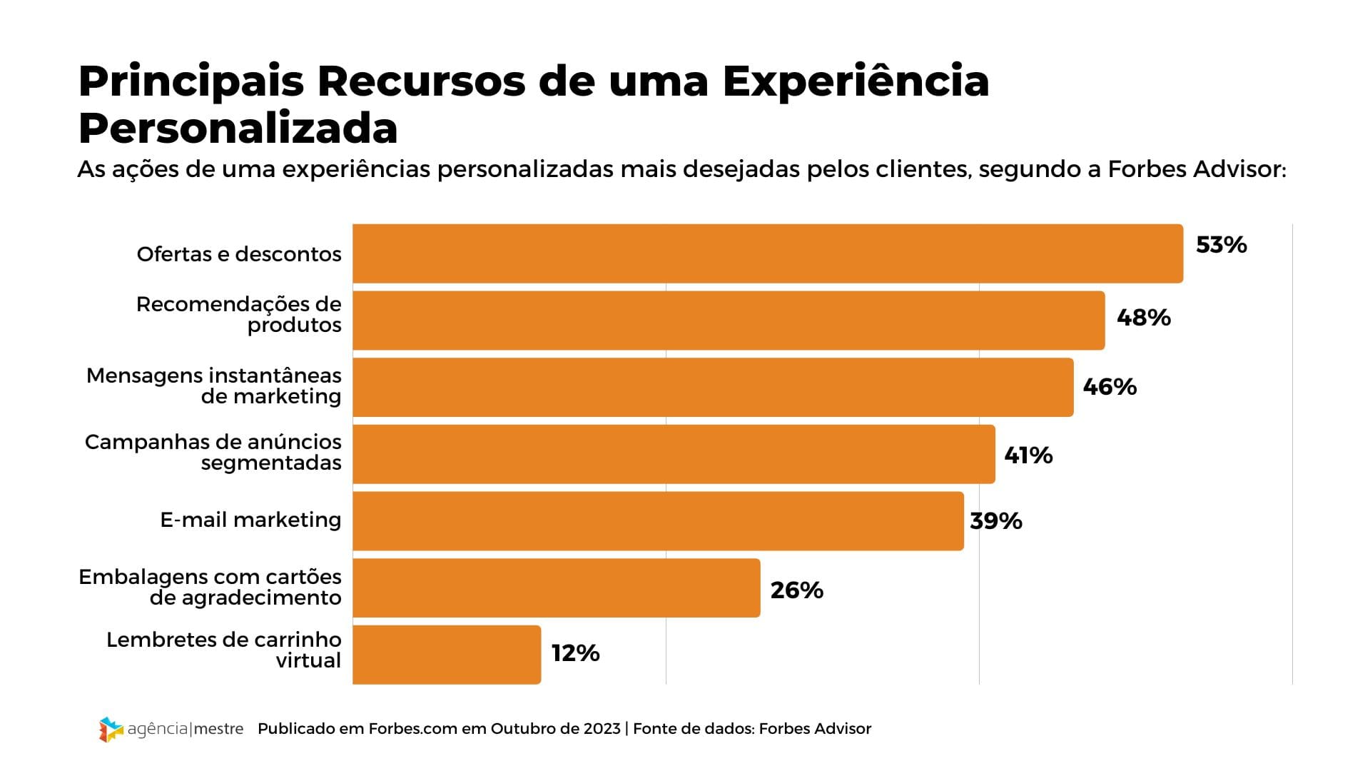 46% dos consumidores afirmam que comprarão mais quando tiverem uma experiência personalizada e 48% está disposto a pagar mais por um atendimento de qualidade. Dentre os diferenciais de personalização da experiência listados pelos consumidores, os descontos personalizados estão no topo da lista: