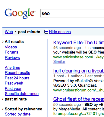 Dado a estrutura da URL, o blog Omgili publicou uma matéria mostrando como pode se alterar parâmetros da consulta do Google para obter resultados em minutos e até segundos!