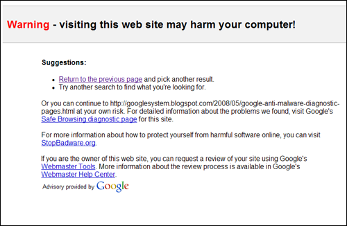 Para os que nunca se depararam com a mensagem de malware do Google, ela é exibida sempre que o Google detecta algum problema atrelado à malware, como vocês podem visualizar abaixo: