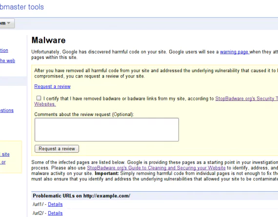 A atualização visa melhorar a informação fornecida ao usuário, que agora pode ser encontrada na aba “Diagnóstico”. Juntamente com isso, os webmasters agora possuem um formulário para descrever que o problema de malware já foi solucionado e assim o Google poderá remover a mensagem de aviso de malware.